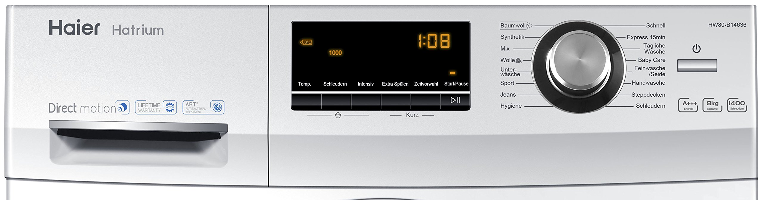 Ziemlich praktisch bei dieser Haier HW80-B14636 Waschmaschine Frontlader / 1400 UpM / super leiser Direktantrieb / weiß: A++, A+, B, 1400 UpM, Vollwasserschutz, Schontrommel, Aqua Protect, 16 Programme, Mengenautomatik, Vollwasserschutz, Endzeitvorwahl, die Optik und die Zusammensetzung